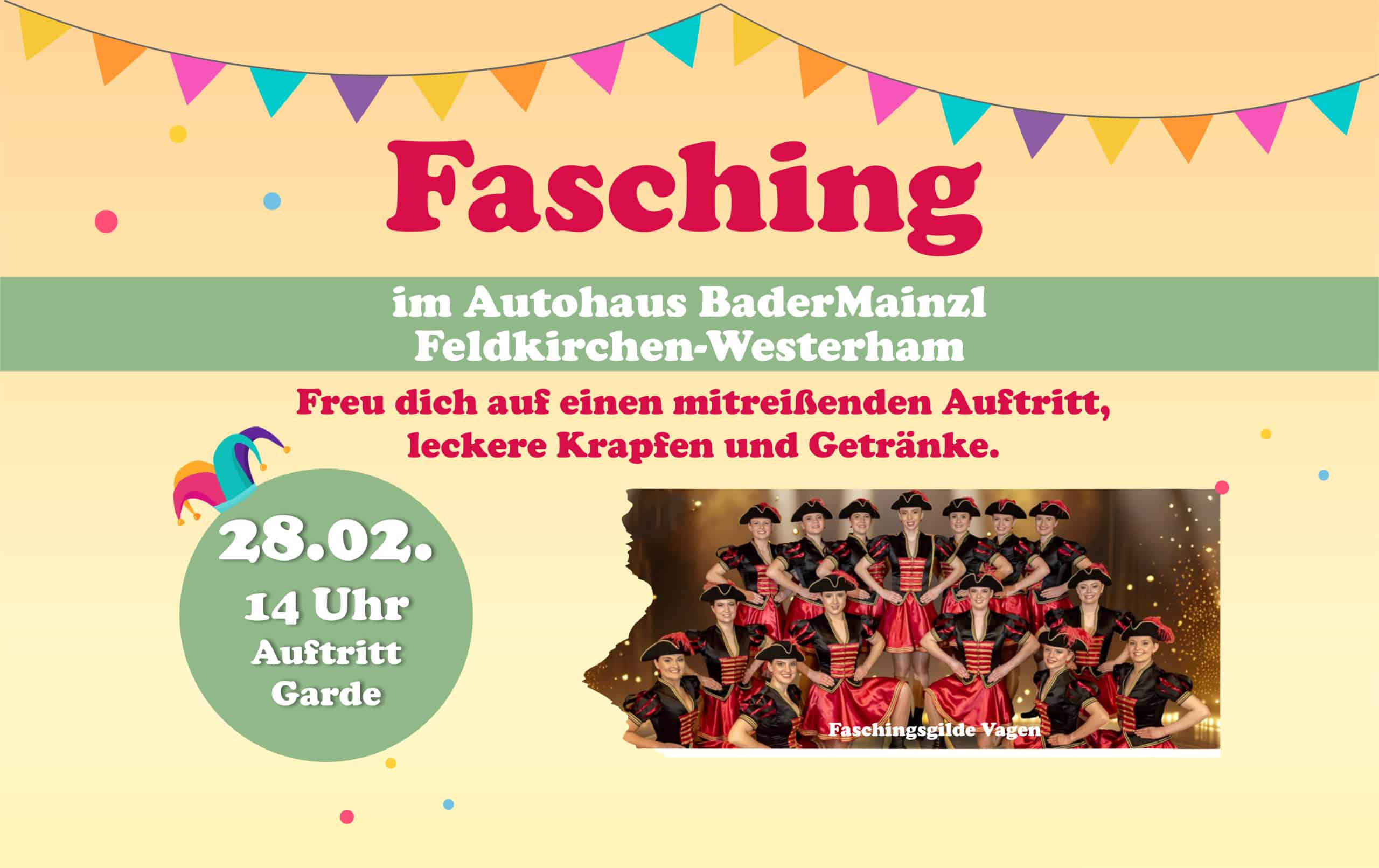 Am Freitag, den 28.02.2025, verwandelt sich das Autohaus BaderMainzl in Feldkirchen-Westerham in eine Faschingshochburg! Die Faschingsgilde bringt mit einem mitreißenden Auftritt um 14 Uhr die Stimmung zum Beben. Natürlich darf auch das leibliche Wohl nicht zu kurz kommen – wir laden dich auf leckere Krapfen und erfrischende Getränke ein!