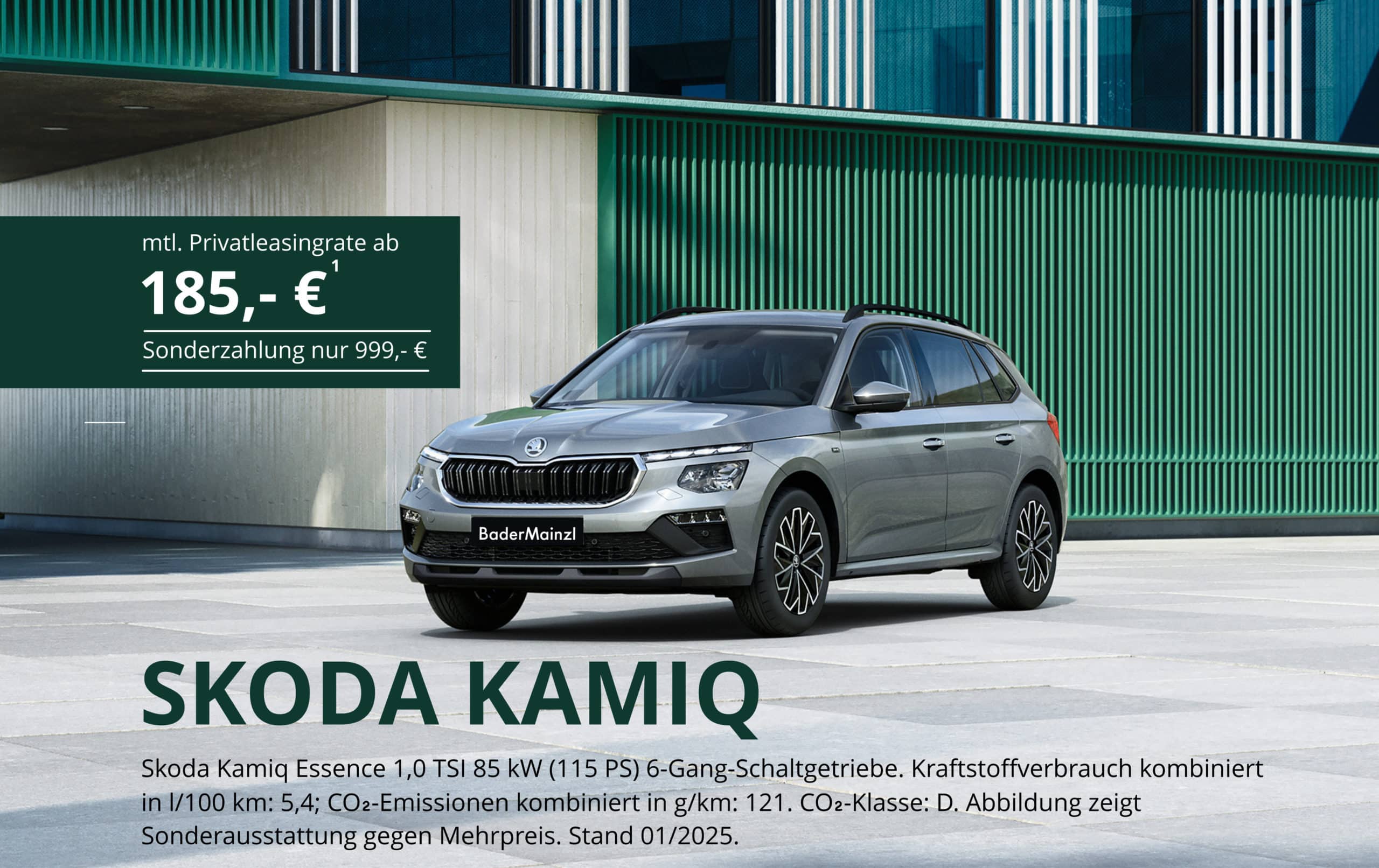 ¹ Privatleasingangebot: Skoda Kamiq Essence 1,0 TSI 85 kW (115 PS) 6-Gang-Schaltgetriebe. Kraftstoffverbrauch kombiniert in l/100 km: 5,4; CO₂-Emissionen kombiniert in g/km: 121. CO₂-Klasse: D.