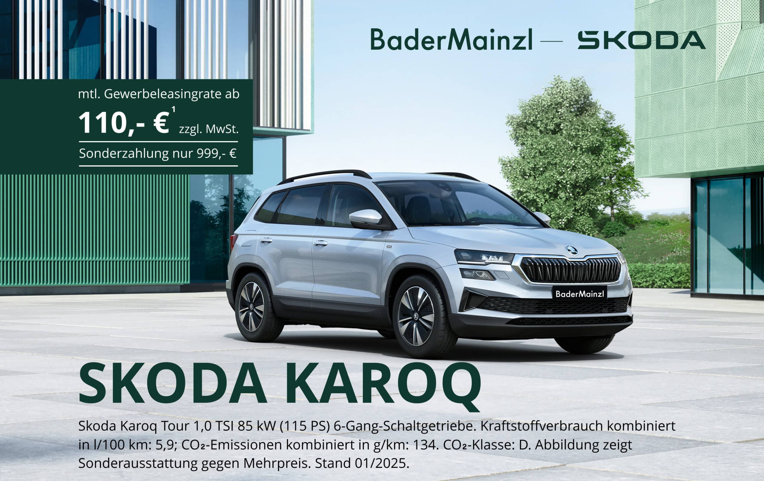 ¹ Gewerbeleasingangebot: Skoda Karoq Tour 1,0 TSI 85 kW (115 PS) 6-Gang-Schaltgetriebe. Kraftstoffverbrauch kombiniert in l/100 km: 5,9; CO₂-Emissionen kombiniert in g/km: 134. CO₂-Klasse: D.