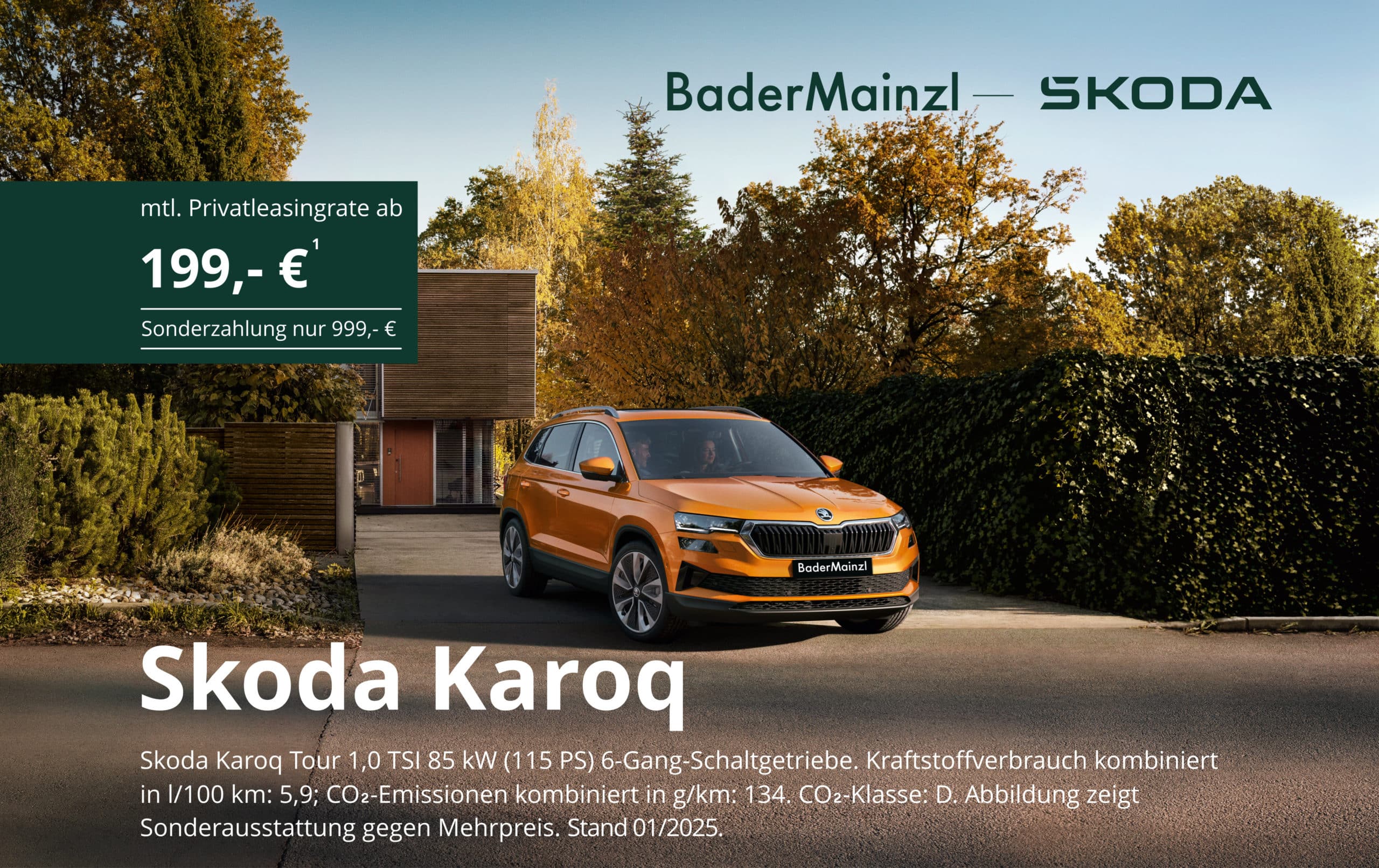 ¹ Ein Leasingangebot der Škoda Leasing, Zweigniederlassung der Volkswagen Leasing GmbH, Gifhorner Straße 57, 38112 Braunschweig, für Privatkunden. Bonität vorausgesetzt. Weitere Informationen erhalten Sie bei uns im Autohaus BaderMainzl. Abbildungen zeigen Sonderausstattungen gegen Mehrpreis. Änderungen und Irrtümer vorbehalten. Überführungskostens- und Zulassungskosten in Höhe von 1.250,- € berechnet der ausliefernde Betrieb separat. Stand 01/2025.