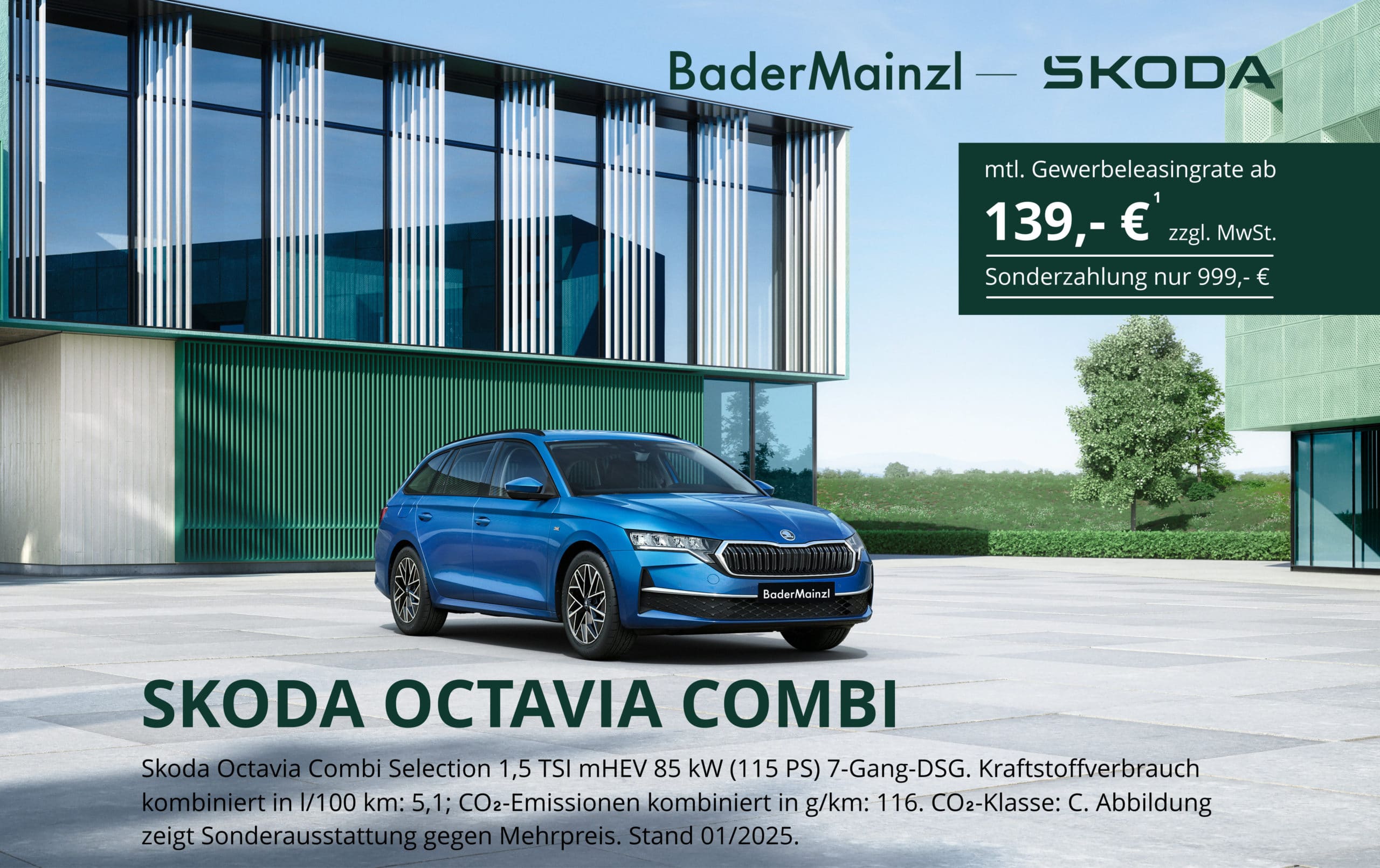 ¹ Gewerbeleasingangebot: Skoda Octavia Combi Selection 1,5 TSI mHEV 85 kW (115 PS) 7-Gang-DSG. Kraftstoffverbrauch kombiniert in l/100 km: 5,1; CO₂-Emissionen kombiniert in g/km: 116. CO₂-Klasse: C.