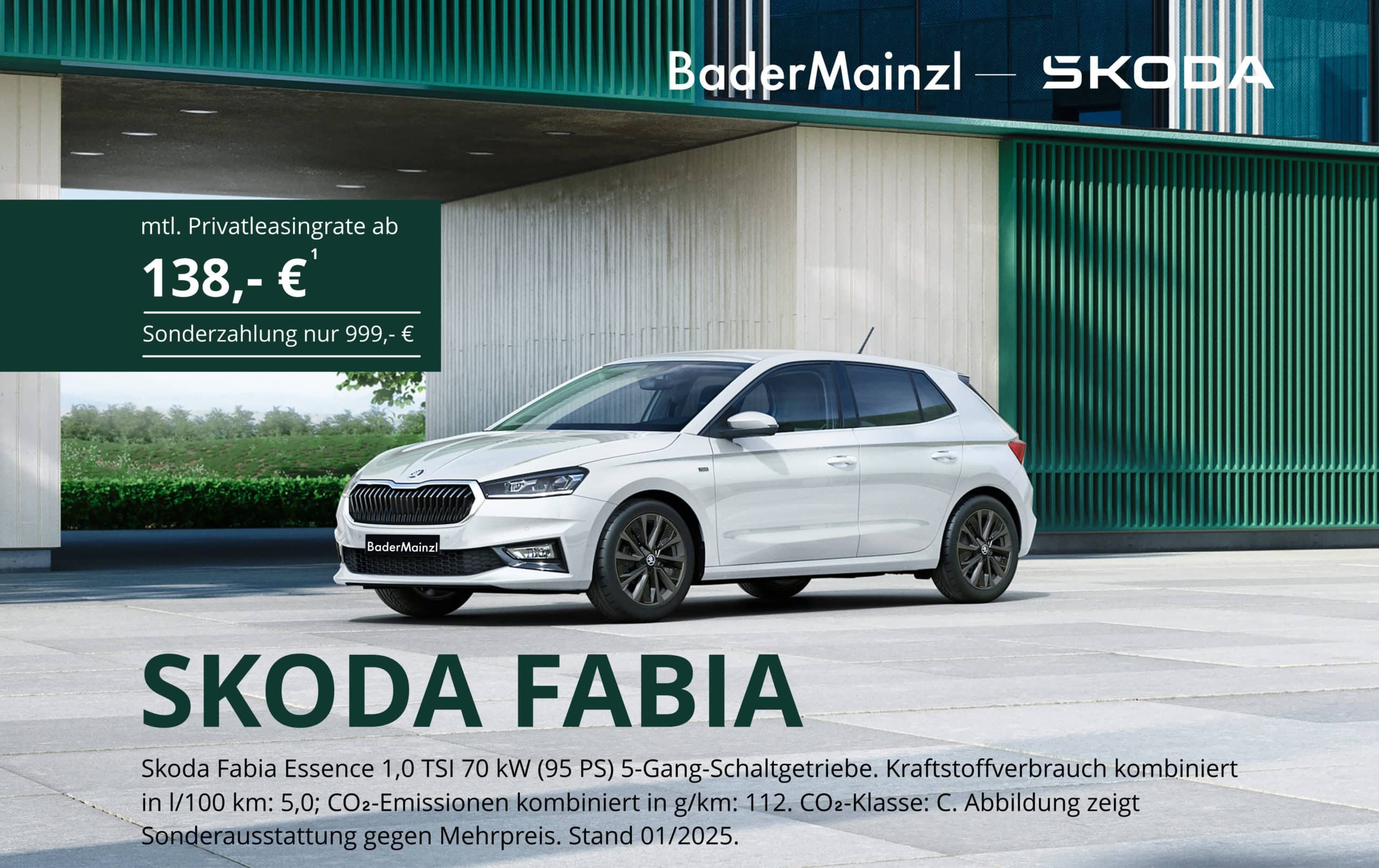 ¹ Privatleasingangebot: Skoda Fabia Essence 1,0 TSI 70 kW (95 PS) 5-Gang-Schaltgetriebe. Kraftstoffverbrauch kombiniert in l/100 km: 5,0; CO₂-Emissionen kombiniert in g/km: 112. CO₂-Klasse: C.