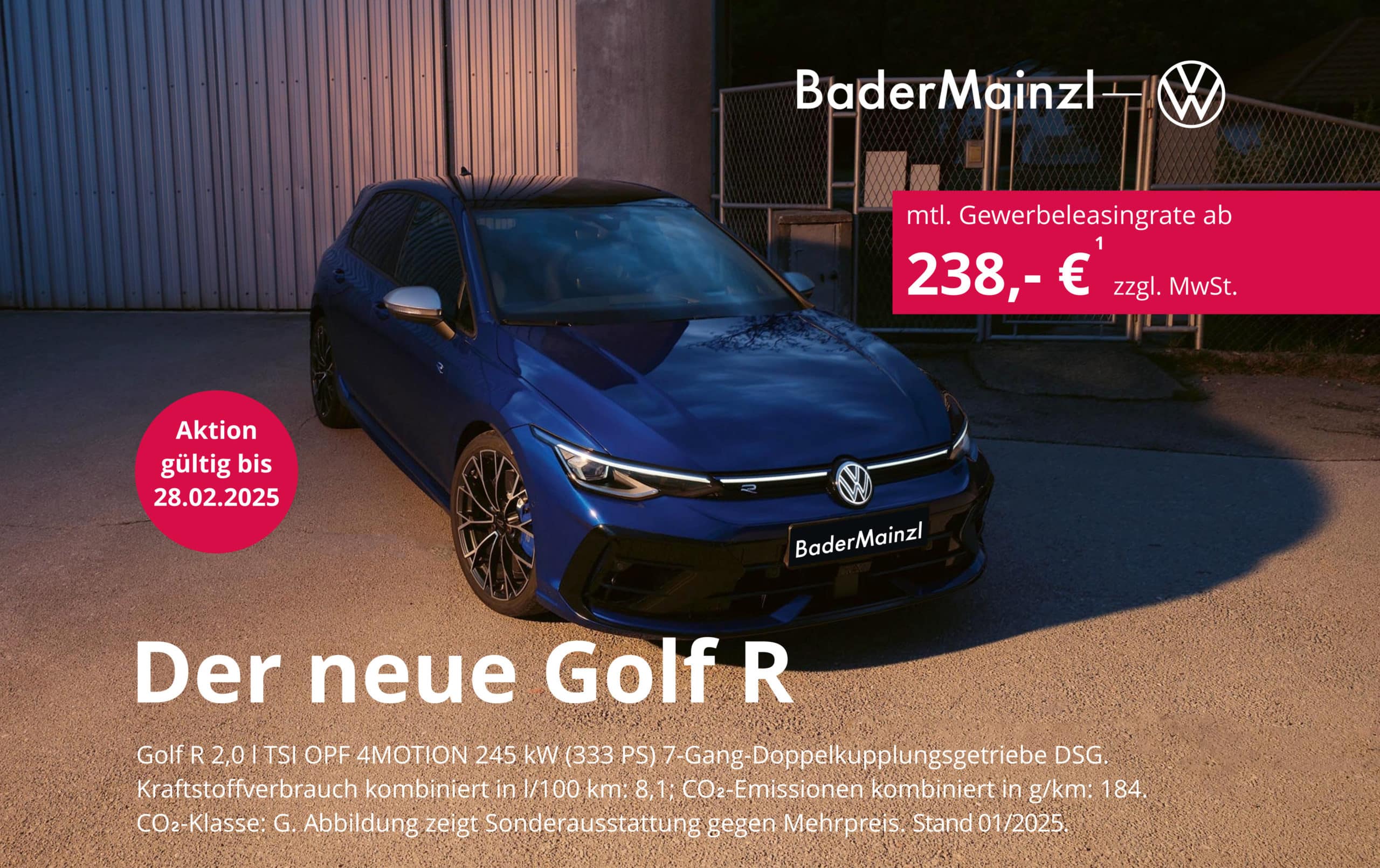 ¹ Gewerbeleasingangebot: Golf R 2,0 l TSI OPF 4MOTION 245 kW (333 PS) 7-Gang-Doppelkupplungsgetriebe DSG. Kraftstoffverbrauch kombiniert in l/100 km: 8,1; CO₂-Emissionen kombiniert in g/km: 184. CO₂-Klasse: G.